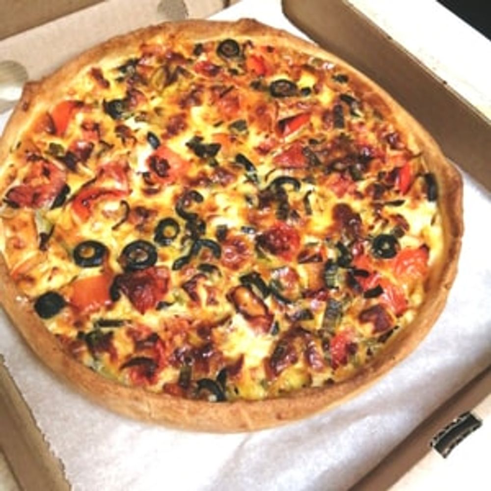 Фантастически вкусный и необычайно красивый 😻 Яркий и богатый состав: сладкий перец, томаты, лук порей, маслины, сыр Чанах, сырная заливка и легкое тесто - идеально для рациона.