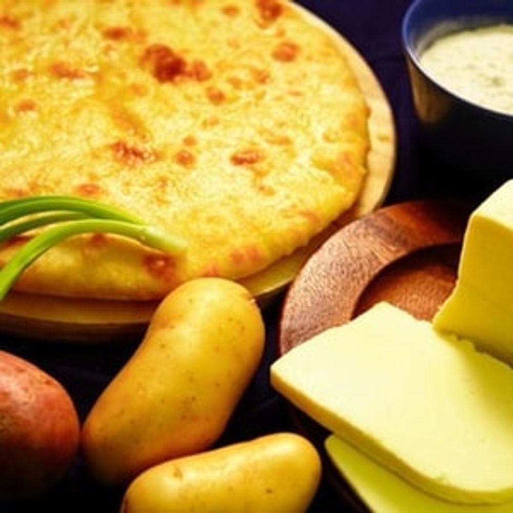 Традиционный Осетинский пирог "Картофджин", приготовленный по старинному рецепту, с начинкой из толченого картофеля и домашнего сыра.